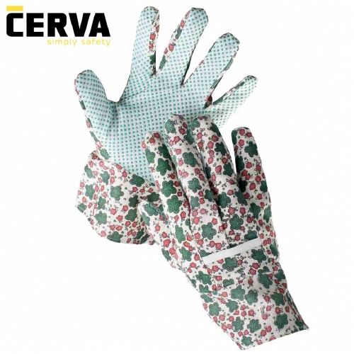 Mănuşi cusute- ţesătură din bumbac imprimat cu motive colorate, palma şi degetele cu aplicaţii punctiforme colorate din PVC.