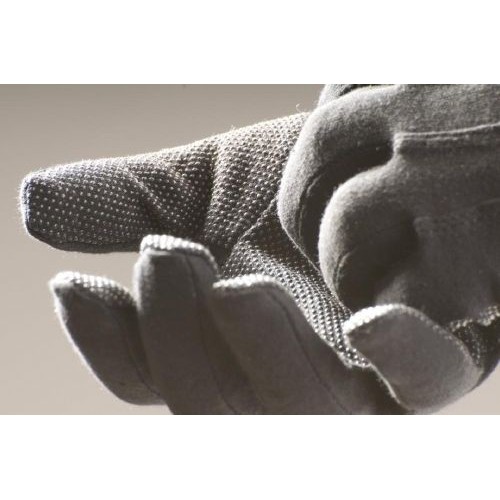 Mănuşi cusute - tricot interlock din bumbac albit, fără manşetă, elastic pe dosul palmei la încheietura mâinii, palma şi degetele cu aplicaţii mărunte din PVC.