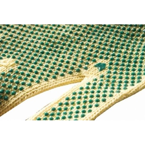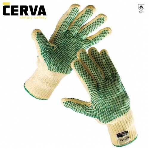 Mănuşi ambidextru, tricotate fără cusături, cu fir Kevlar de rezistenţă medie, cu picouri de PVC în palmă, pe dosul palmei şi degete.