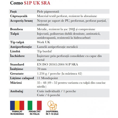 | Talpă | Injectată din poliuretan dublă densitate, bicolcoră, antistatică, antiderapantă, rezistentă la abraziune şi hidrocarburi |
