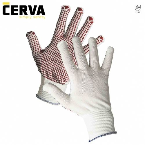 Mănuşi tricotate albe, din nylon, manşetă elastică, palma şi degetele cu aplicaţii punctiforme din PVC.