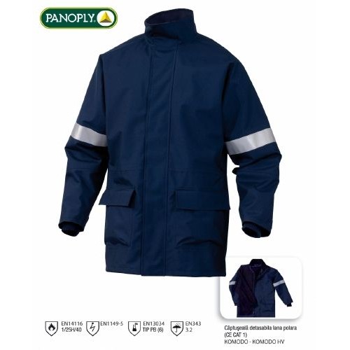 Tesatura 98% poliester 2% fibra antistatica impregnata cu Poliuretan. Captuseala fixa 100% bumbac ignifug. Captuseala detasabila lana polara 100% poliester. Bandes Loxy refl ectorizante cusute.