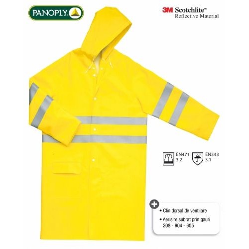 Manta de ploaie. Cusaturi sudate. Gluga fixa. Mâneci raglan. Inchidere cu fermoar sub fenta cu butoni de presiune. Inalta vizibilitate : Clasa 3 - Culoare argintie - Montare in paralel. 1 buzunar sub clapa.