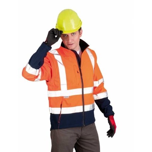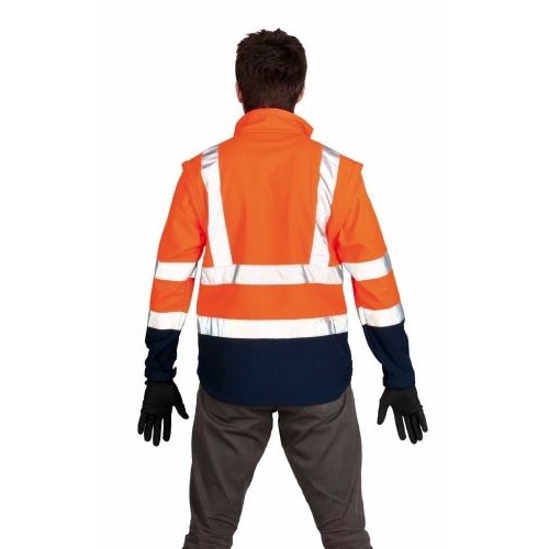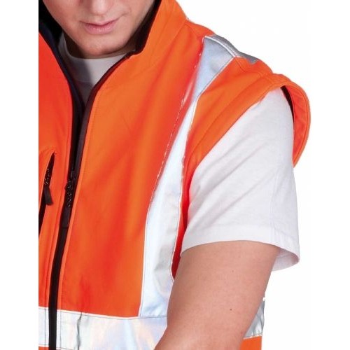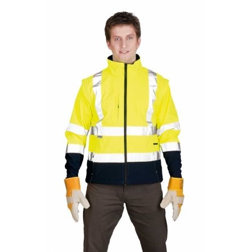 Jachetă cu mare vizibilitate, conform normei EN 471, impermeabilă la apă, permeabilă la abur, cu căptuşeală fleece, mâneci detaşabile, benzi reflectorizante 3M.