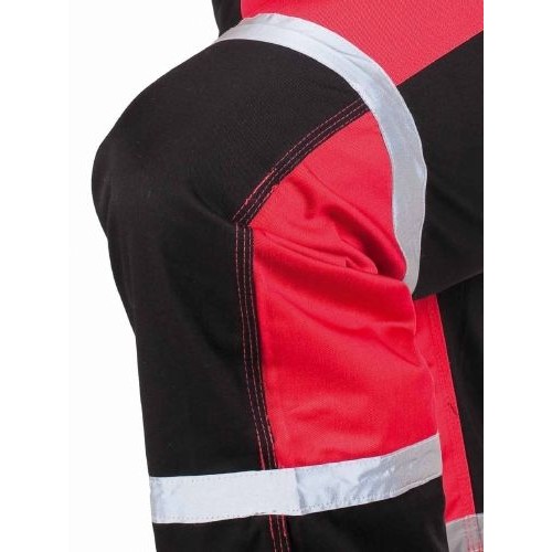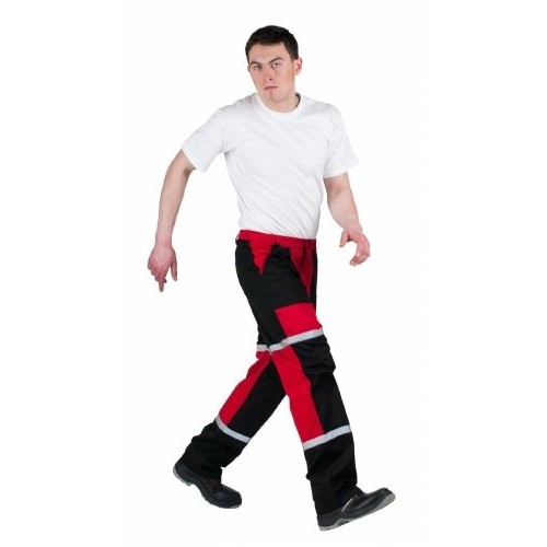 Pantaloni de culoare roşu cu negru cu dungi reflectorizante. Materialul este compus din bumbac 35% şi 65% poliester, 320 g/m², genunchii sunt întăriţi cu 600D poliester Oxford / PU. Genunchierele de protecţie pot fi introduse într‑o săculeţ special, pantalonii au găici.